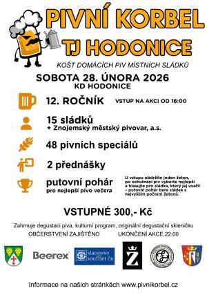 Zveme vás na 12. ročník akce Pivní korbel, která se koná v sobotu 28. února 2026 v KD Hodonice. Od 16:00 si můžete vychutnat 48 pivních speciálů od 15 místních sládků. Vstupné 300 Kč zahrnuje degustaci piva, kulturní program a originální degustační skleničku.