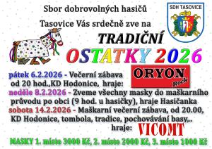 SDH Tasovice Vás v rámci tradičních Ostatků zve na večerní zábavu s kapelou ORYON, a to v pátek 6.2.2026 od 20 hodin v KD Hodonice.