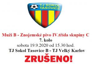 Zápas TJ Sokol Tasovice B - TJ Velký Karlov, který se měl hrát v sobotu 19.9.2020 od 15.30, je zrušen. Velký Karlov nepřijede kvůli malému počtu hráčů.
