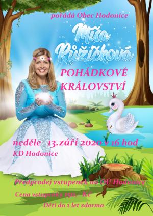 Pozvánka na minidiskotéku s Míšou Růžičkovou - Pohádkové království, v neděli 13. září 2020 od 16 hodin v KD Hodonice.