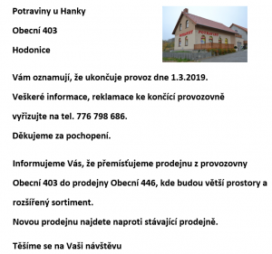 INFORMACE O ZNOVUOTEVŘENÍ POTRAVIN U HANKY