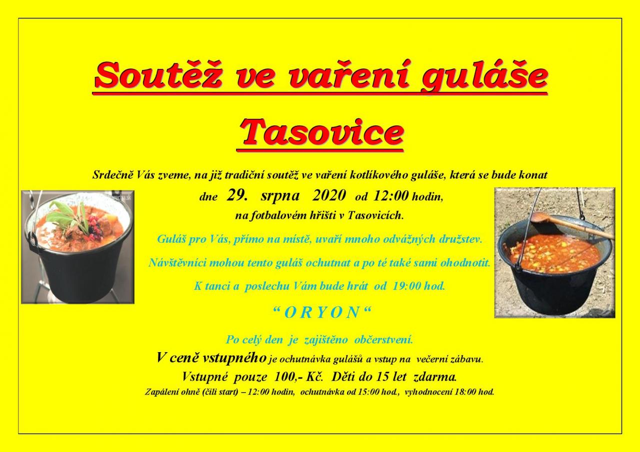 Pozvánka na soutěž ve vaření kotlíkového guláše dne 29. srpna 2020 od 12 hodin na fotbalovém hřišti v Tasovicích.