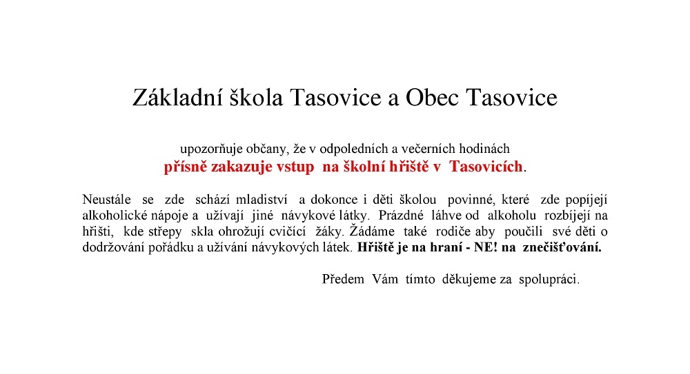 OZNÁMENÍ ZŠ TASOVICE - ZÁKAZ VSTUPU NA ŠKOLNÍ HŘIŠTĚ