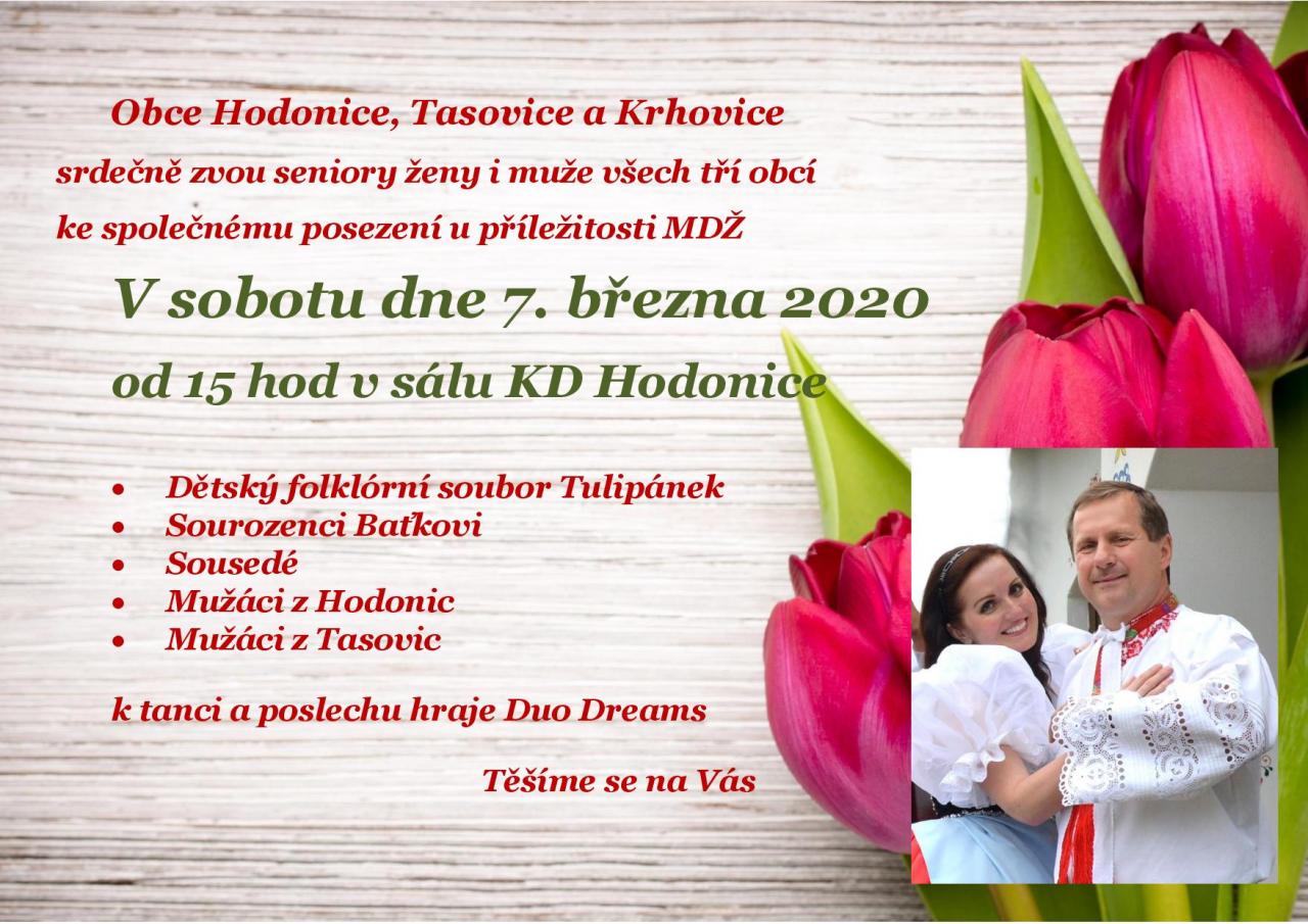 Obce Tasovice, Hodonice a Krhovice zvou seniory na posezení u příležitosti MDŽ v sobotu 7. března 2020 od 15 hod. do sálu KD Hodonice.
