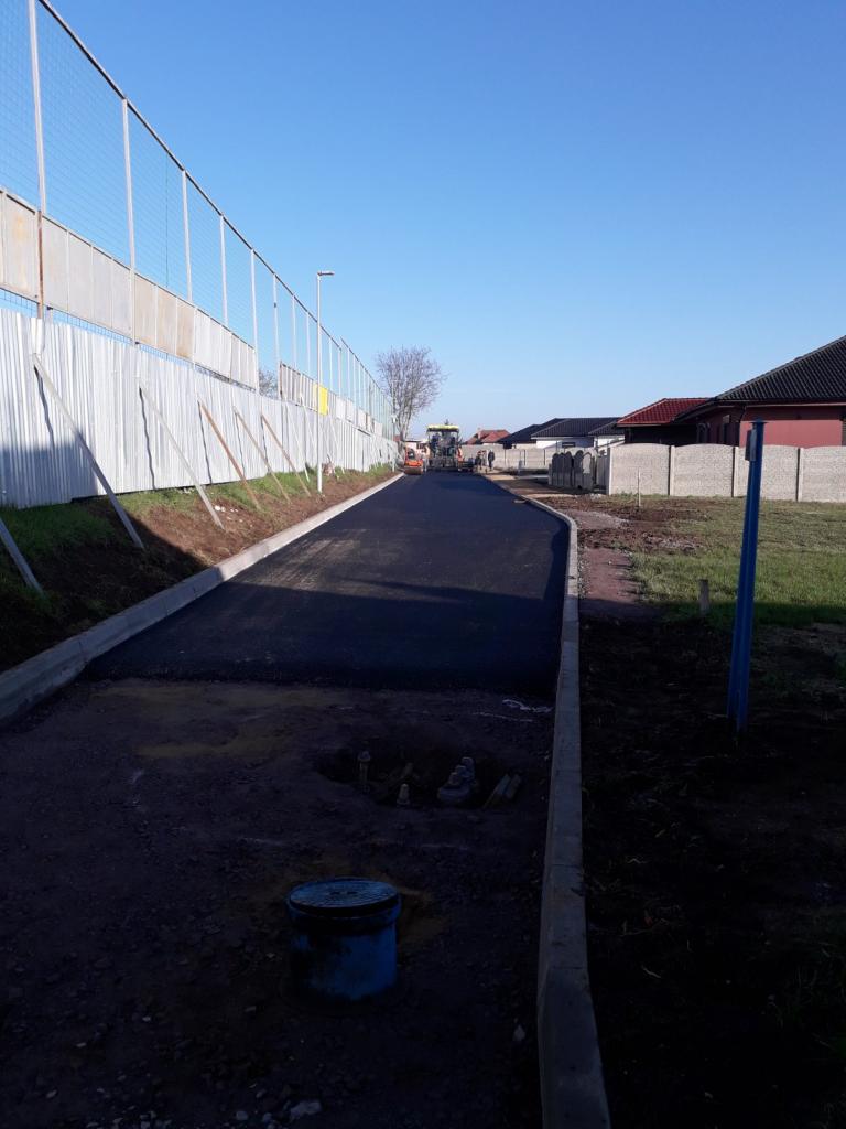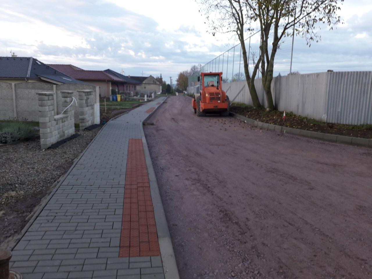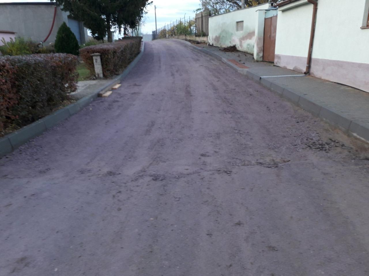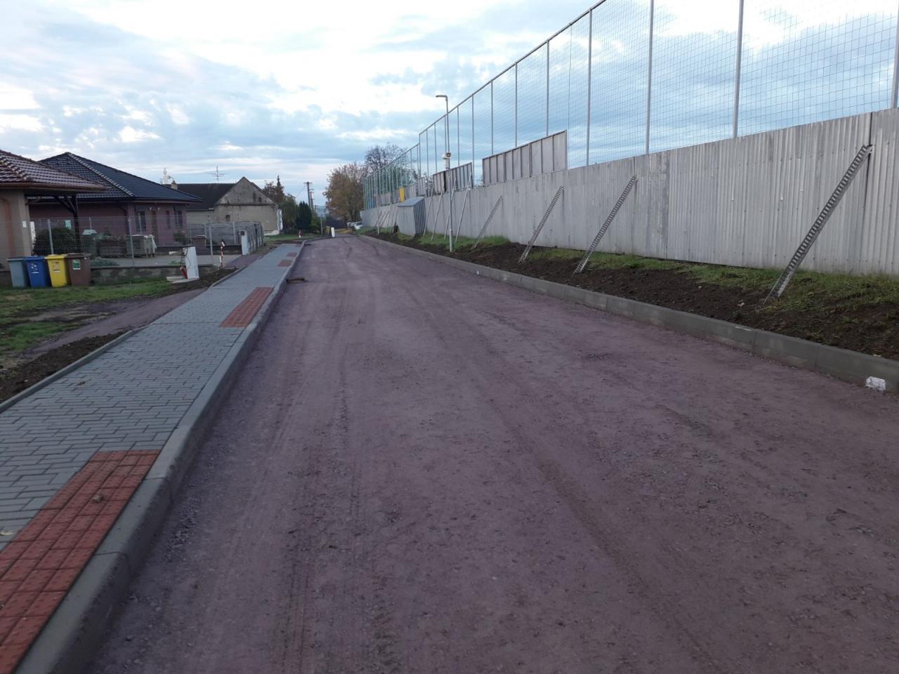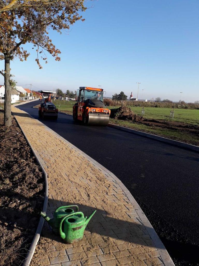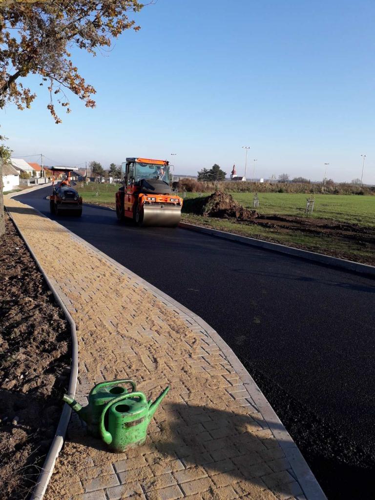 Postup prací - rekonstrukce silnice za hřištěm. První vrstva asfaltu je položena, druhá se bude pokládat 16.11.2020.