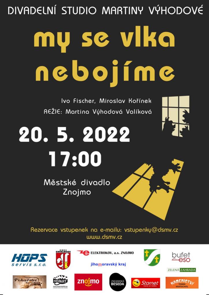 Rádi bychom Vás pozvali na naše divadelní představení "My se vlka nebojíme"- Jedná se o hudební pohádku, která nadchne malé i velké diváky. Představení se bude konat v pátek 20. 5. 2022 v 17.00 v Městském divadle ve Znojmě.