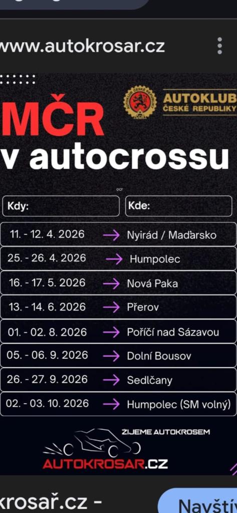 Pozvánka na příští týden do Humpolce na Mistrovství republiky a zóny střední Evropy, kde Adam pojede mezi nejlepšími jezdci a bude bojovavat o nejvyšší stupeň na umístnění ... kdo sleduje ..Svět motorů v ČT..tam jsou informace i videa z maďarského Nyiradu kde nastupoval do finále mezi nejlepšími jezdci autokrosu .....přijeďte fandit do Humpolce již příští týden ...potřebujeme podporu fanoušků 😂