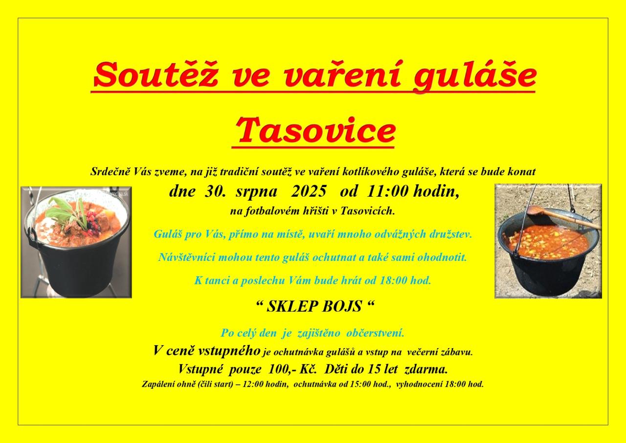 Srdečně vás zveme na již tradiční soutěž ve vaření kotlíkového guláše, která se uskuteční 30. srpna 2025 od 11:00 hodin na fotbalovém hřišti v Tasovicích. Mnoho odvážných družstev připraví guláš přímo na místě, který si návštěvníci budou moci ochutnat a ohodnotit. O zábavu se postará hudební skupina SKLEP BOJS od 18:00 hodin a po celý den bude k dispozici občerstvení. Vstupné je 100 Kč, děti do 15 let mají vstup zdarma. Oheň bude zapálen v 12:00 hodin, ochutnávka začne od 15:00 hodin a vyhodnocení proběhne v 18:00 hodin.