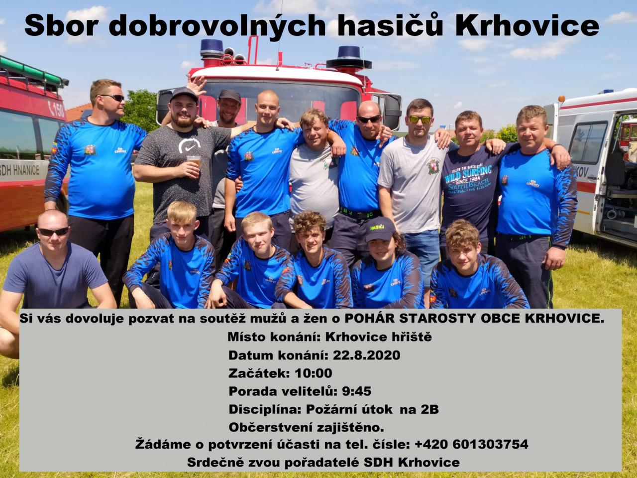 Pozvánka SDH Krhovice na soutěž mužů a žen O pohár starosty obce Krhovice dne 22.8.2020 v 10 hodin na hřišti v Krhovicích.