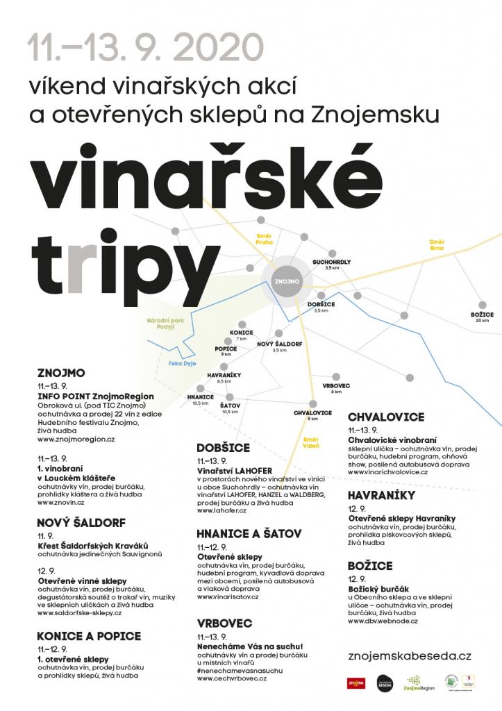 Nenechte si ujít jedinečnou vinařskou akci, která nese název Vinařské t(r)ipy. Bude se konat 11. až 13. září v termínu, který patří Znojemskému historickému vinobraní. Těšit se můžete na otevřené sklepy a různý kulturní program v obcích Nový Šaldorf, Vrbovec, Chvalovice, Hnanice a Šatov, Konice a Popice, Havraníky a v neposlední řadě také v Louckém klášteře ve Znojmě a v novém vinařství Lahofer u obce Suchohrdly.