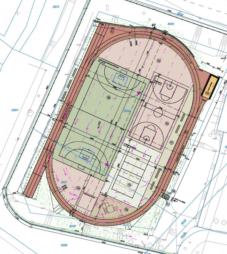 Návrh rekonstrukce školního hřiště a atletického oválu ZŠ a MŠ Tasovice.