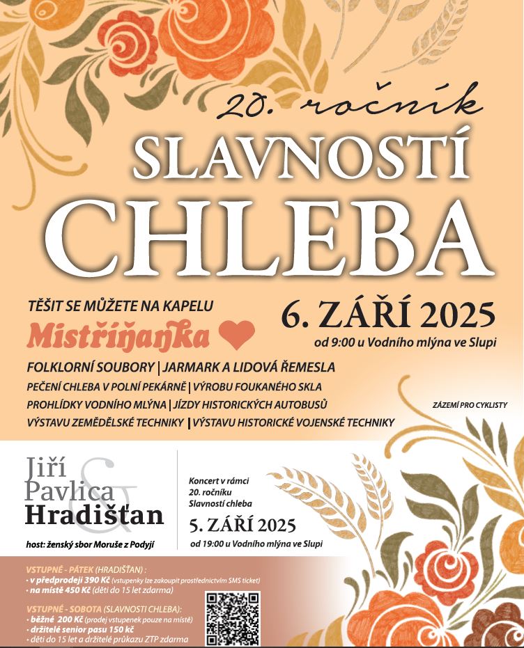 6. září 2025 se u Vodního mlýna ve Slupi uskuteční folklorní festival s bohatým programem pro návštěvníky všech věkových kategorií. Na své si přijdou nejen milovníci tradiční kultury, ale také zájemci o lidová řemesla a historickou techniku. K dispozici budou prohlídky vodního mlýna, pečení chleba v polní pekárně a výstavy zemědělské a historické techniky. Navíc se můžete těšit na koncert hostujícího ženského sboru Moruše z Podyjí.