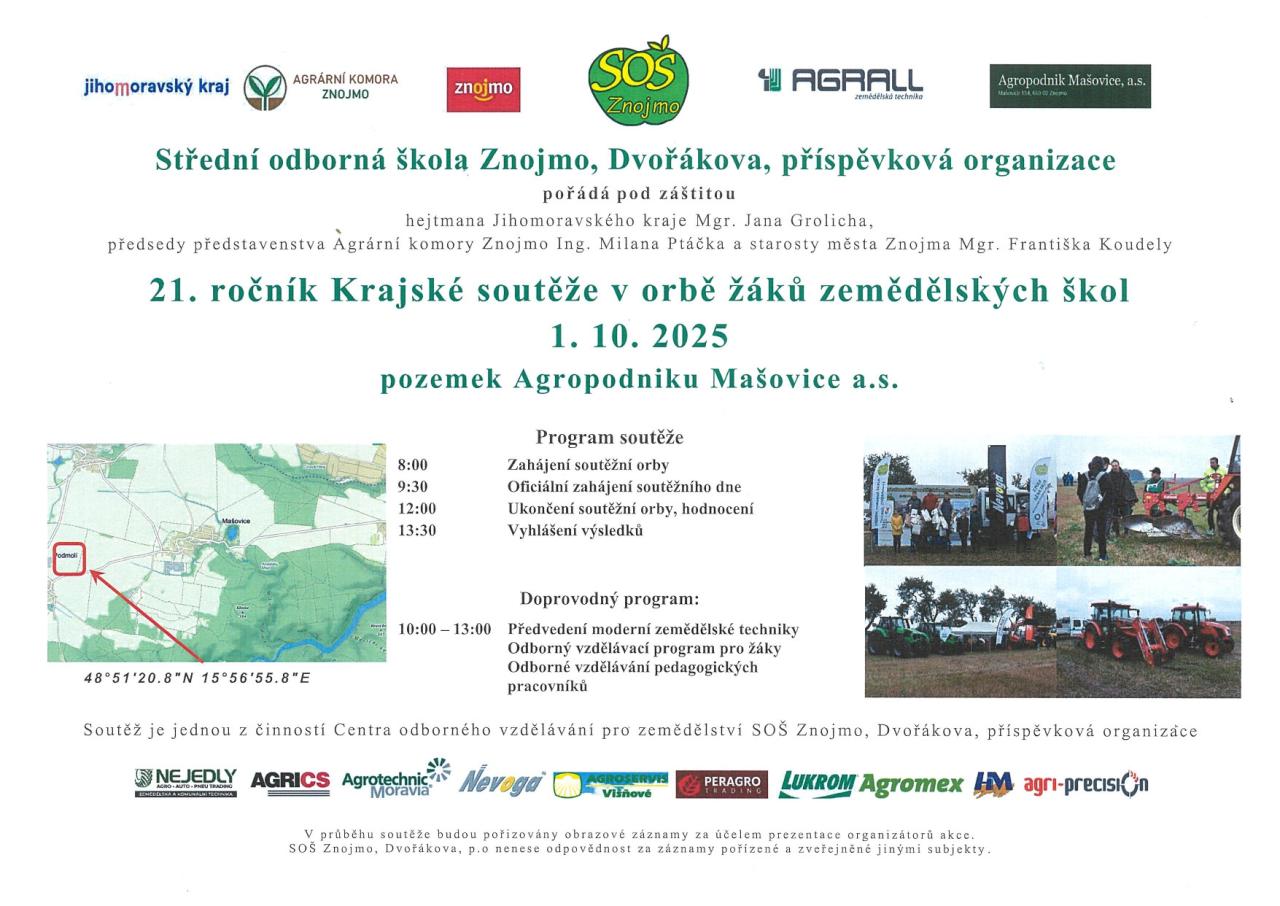 Střední odborná škola Znojmo, Dvořákova, příspěvková organizace, pořádá 21. ročník Krajské soutěže v orbě žáků zemědělských škol. 1.10.2025 na pozemku agropodniku Mašovice a.s. Více v přiložené pozvánce.