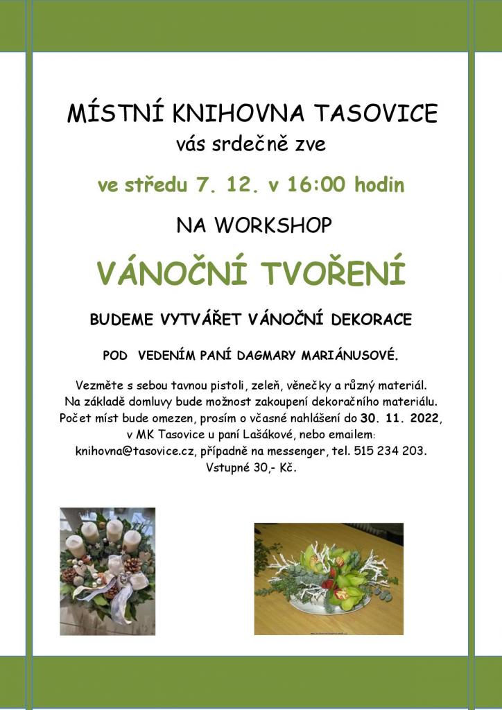 Místní knihovna Tasovice Vás srdečně zve ve středu 7.12.2022 v 16 hodin na WORKSHOP VÁNOČNÍ TVOŘENÍ.