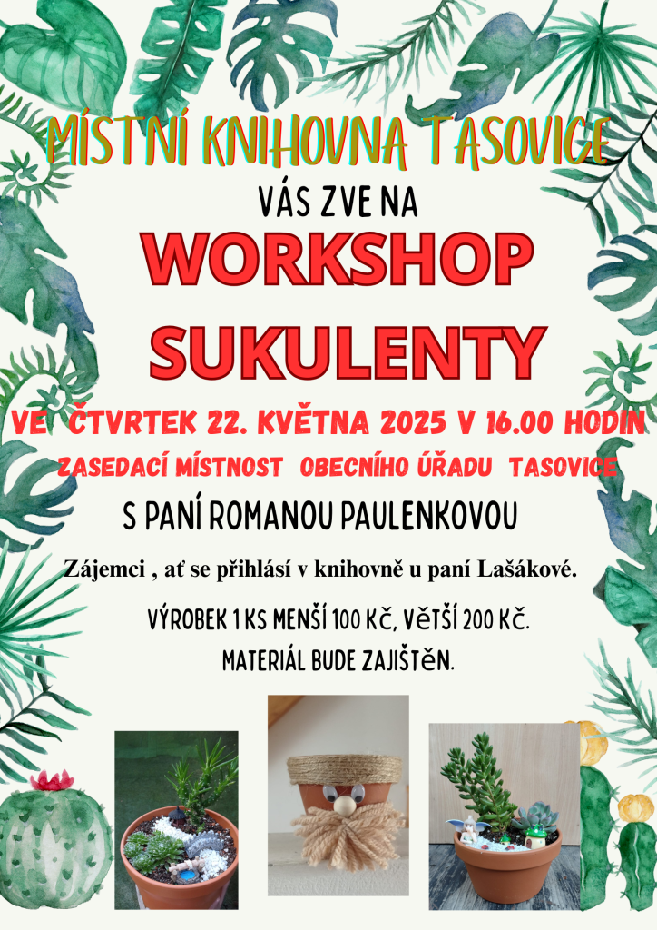 V rámci workshopu, který povede paní Romana Paulenková, se účastníci naučí, jak správně pěstovat a vytvářet aranžmá se sukulenty. Materiál bude zajištěn a účastníci si mohou vyrobit jeden menší kousek za 100 Kč nebo větší za 200 Kč. Přihlaste se prosím v knihovně u paní Lašákové.